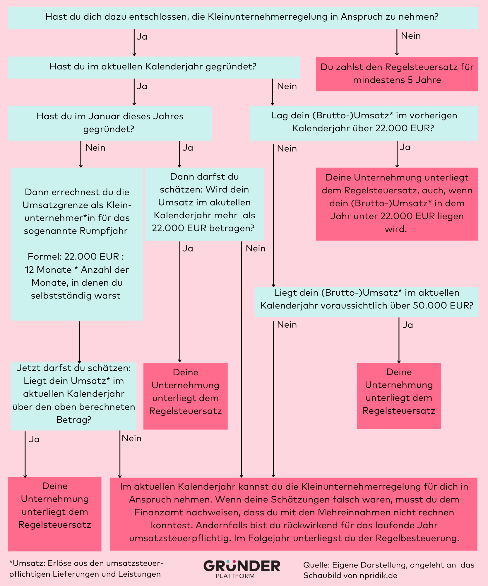 - Bei deiner Gründung kannst du mit einem Jahresumsatz von maximal 25.000 EUR netto (bis 2024: 22.000 EUR brutto) selbst entscheiden, ob du die Kleinunternehmerregelung nutzen möchtest.