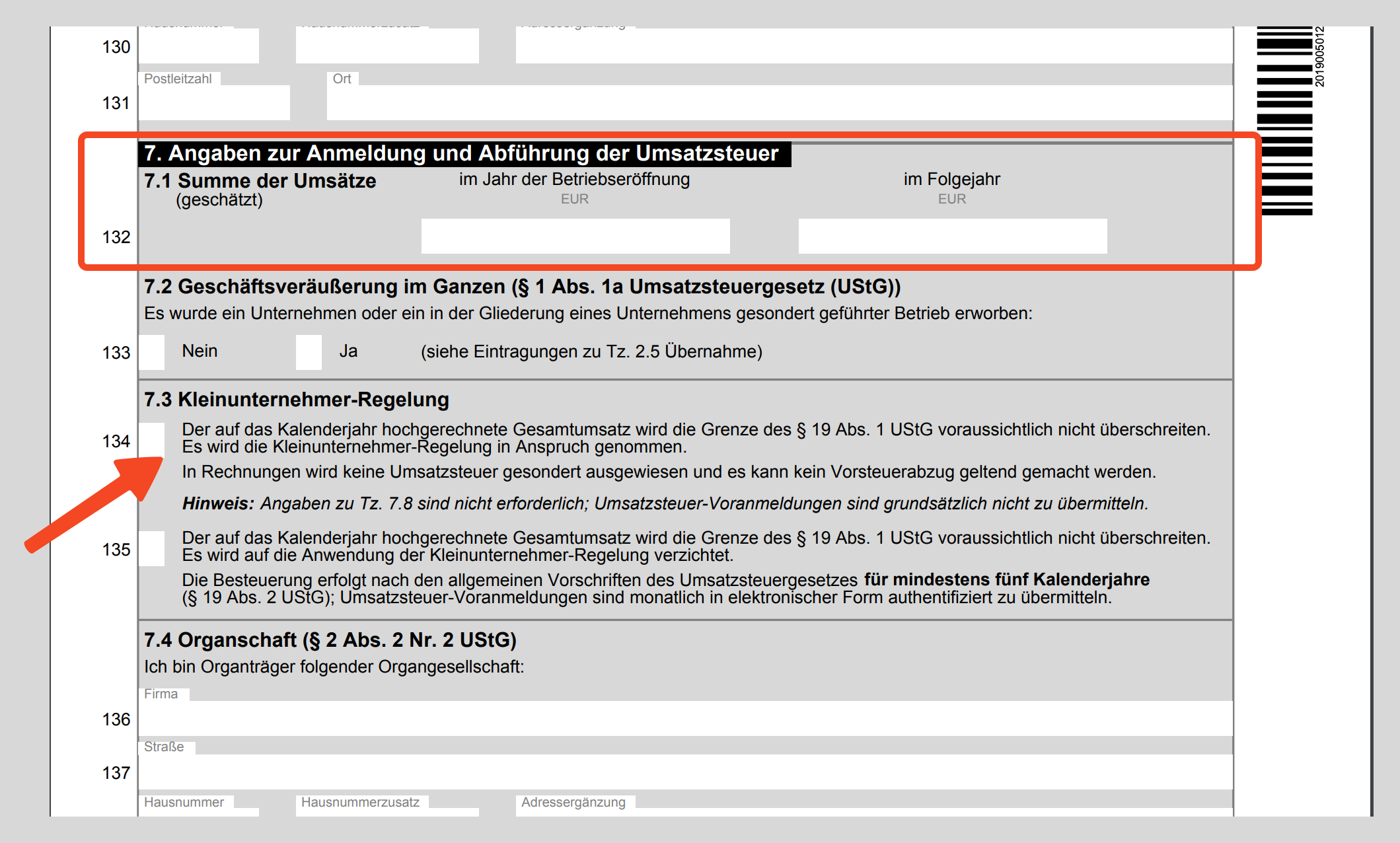 Wenn du dies tun willst, trägst du im "Fragebogen zur steuerlichen Erfassung" in Zeile 132 deine Umsatzschätzungen für das laufende Jahr ein und setzt den Haken in Zeile 134.