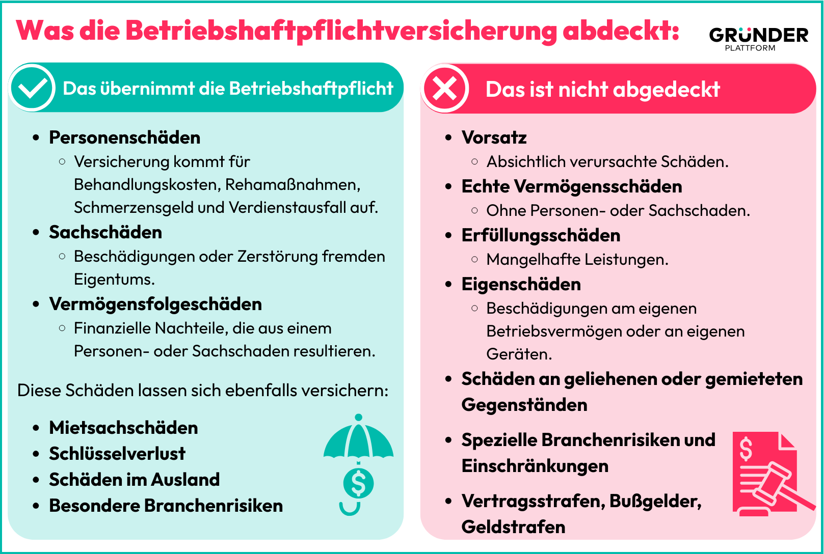 Eine Betriebshaftpflichtversicherung federt diese Risiken ab. Sie übernimmt berechtigte Forderungen und wehrt unberechtigte ab.